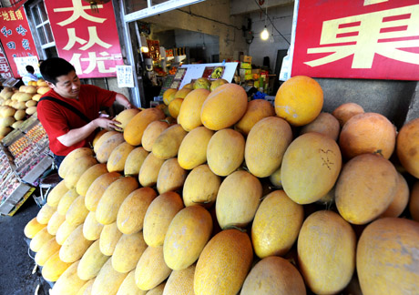 7月13日,一名水果商販在烏魯木齊北園春農產品中心批發市場擺放哈密瓜。 目前正值新疆烏魯木齊各種時令水果消費旺季,當地農業部門從吐魯番、葉城、石河子等地組織大量西瓜、哈密瓜、杏、葡萄等水果投放市場,受到市民歡迎。