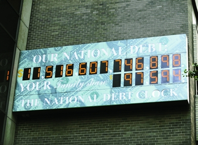 這是2009年7月13日在美國紐約市中心拍攝的聯邦財政赤字計數牌。美國財政部當天公布的數據顯示,在截至6月30日的2008-2009財政年度的前9個月,美國聯邦財政赤字首次超過1萬億美元。