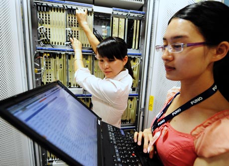 7月20日,福建福諾移動通信技術有限公司工程技術人員在進行通信系統調試。 福建軟件業等新興產業發展迅速,據福建省信息產業廳統計,2009年上半年全省共實現軟件及系統集成銷售收入176億元,同比增長30%;純軟件出口4260萬美元,增長25%。