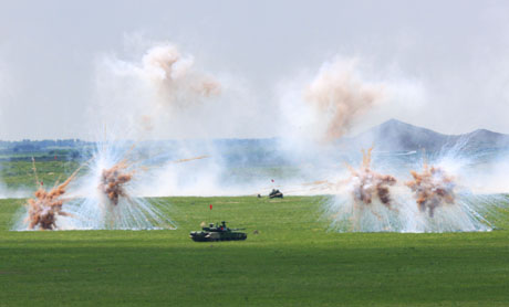 7月23日上午,中方參演裝甲戰車在進攻中發射電子干擾彈。 當日,中央軍委委員、中國人民解放軍總參謀長陳炳德上將、俄羅斯聯邦國防部第一副部長兼武裝力量總參謀長馬卡羅夫大將,在沈陽軍區洮南合同戰術訓練基地共同觀看了中俄聯合軍演,并在野營村與參演官兵共進午餐。
