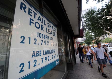 22日,行人從美國紐約曼哈頓一處正在招租的門面房前經過。據《紐約時報》21日報道,隨著紐約居民削減日常開支,紐約街頭的連鎖店、家庭式店鋪等商店已開始逐步減少。而據全美大型房地產經紀公司馬庫斯·米利切普的統計,曼哈頓地區目前門面房的空置率達6.5%,為近20年來最高,預計到2010年年中將達10%。