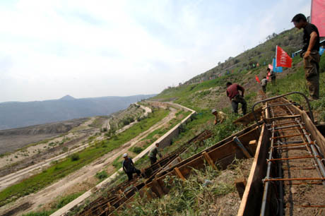 7月27日,工人們正在加固海州露天礦的礦坑圍坡,這是海州露天礦國家礦山公園建設的重點項目之一。 當日,遼寧省阜新市海州露天礦國家礦山公園正式開園,這個當年亞洲最大的露天煤礦變身為工業遺產主題公園。 海州露天礦由前蘇聯列寧格勒煤礦設計院設計,1953年投產,是當時亞洲最大的機械化露天煤礦。2005年7月,該礦因煤炭資源的枯竭閉坑破產,留下了一個長四公里、寬兩公里、垂深350米的長方形人工廢棄礦坑。
