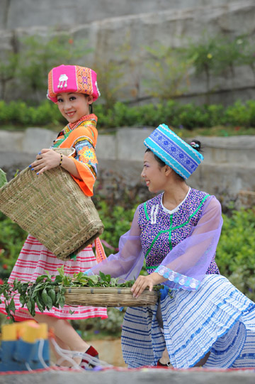 7月26日,兩名演員在“藥王谷之夏”活動現場表演采集藥材。 當日,由貴州清鎮市旅游局主辦的“藥王谷之夏”麥格生態民俗文化節系列活動在清鎮市麥格苗族布依族鄉正式啟動。在為期3天的活動中,主辦方將舉辦民族風情攝影展、“六月六”布依歌會、民族服飾展、自行車自駕游等11項活動。