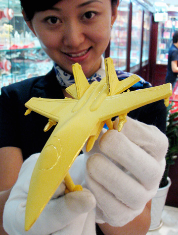 7月29日,濟南一家金店的工作人員展示飛機造型的純金擺件。