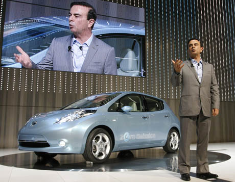 8月2日,日本日產自動車公司首席執行官卡洛斯·戈恩在位于橫濱的新總部大樓的揭幕儀式上介紹其首款純電動汽車“葉子”。日產表示,“葉子”將于2010年底投放市場,先期在日本、美國和歐洲市場銷售。