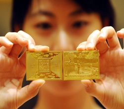 8月10日拍攝的《開國大典》郵票金磚。當天,中鈔國鼎投資有限公司和中國集郵總公司發行的中國首款郵票金磚———紀念中華人民共和國成立六十周年《開國大典》郵票金磚在京上市。該產品采用純金鑄造,每枚重60克,全國限量發行6000枚,并配有收藏證書和唯一編號。新華社發