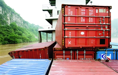 發生事故的集裝箱船上部分集裝箱落水(8月11日攝)。一艘裝載有危險化學品的集裝箱滾裝船10日深夜在長江三峽大壩—葛洲壩水域發生集裝箱落水事故,幸無人員傷亡。目前已知有62個集裝箱落入江中,其中部分屬于;芳b箱。長江海事局已啟動應急預案,派出4艘海事巡邏艇趕赴現場開展應急處置及海事調查工作,并調集大馬力拖輪前往現場施救。同時,進行船閘控制運行,協調梯調中心控制葛洲壩下泄流量。新華社發