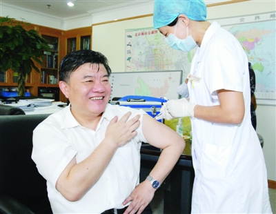 作為我國第一個甲型H1N1流感疫苗受試者,衛生部部長陳竺8月11日下午接種第二針。(圖片來源:衛生部網站)
