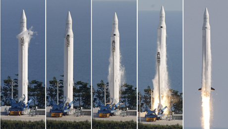 8月25日,在韓國南部的羅老宇航中心,韓國首枚運載火箭“羅老”號發射升空(拼版照片)。韓國羅老宇航中心當日宣布,“羅老”號運載火箭應于306公里高度進行分離,但實際分離高度為342公里,二級火箭未進入預定軌道,“屬于部分發射失敗”。