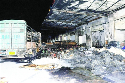 9月3日凌晨拍攝的化學品爆燃事故現場。9月2日下午,山東省臨沂市蘭山區金蘭物流城F3區發生一起由裝載化學物品的貨車在卸車過程中引發的意外爆燃事故,共造成18人死亡、10人受傷。事故原因正在調查中。