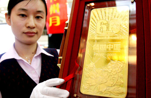 圖為一名工作人員展示重達10000克的“盛世中國”紀念金條。