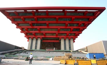 這是9月15日拍攝的建設中的中國2010年上海世博會中國館。 中國2010年上海世博會中國館正在加緊施工中,工程預計將于2009年底前全部竣工。