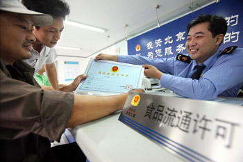 9月17日,個體工商戶余明(左)從北京市工商局西城分局新街口工商所工作人員手中領到食品流通許可證。 當日,北京市西城區首批個體工商戶領到了食品流通許可證。根據國家工商總局《食品流通許可證管理辦法》,從9月1日起,北京市工商局正式啟動食品流通許可工作,對全市范圍內的商場、超市、市場、食雜店以及影劇院、加油站、報刊亭等從事批發或零售預包裝食品、散裝食品的經營企業和個人實施食品流通許可。
