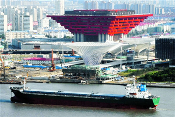 圖為正在施工的上海世博園區永久性標志建筑———世博軸和中國館(紅色)。 近日,上海世博園區建設正緊張進行,五大永久性標志建筑“一軸四館”(世博軸、中國館、主題館、演藝中心、世博中心)已全部封頂,進入內部裝修施工階段。 新華社發