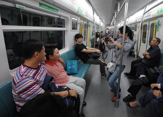 9月28日,乘客在地鐵四號線車廂內拍照留念。 當日,北京地鐵4號線開通試運營。北京地鐵4號線是繼地鐵5號線之后北京市另一條貫穿市區南北的軌道交通主干線,該線全長28.2公里,設24座車站,沿線設換乘站9座。4號線的開通,使北京軌道交通運營里程接近230公里,車站達147座。