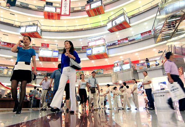 10月8日,上海市長寧路上的一家大型商廈內顧客來來往往。當日,上海市假日辦發布的最新統計數據顯示,截至10月7日,遍布上海市的十家主要大型百貨商廈“十一”長假期間實現零售總額5.63億元,同比增長65%。