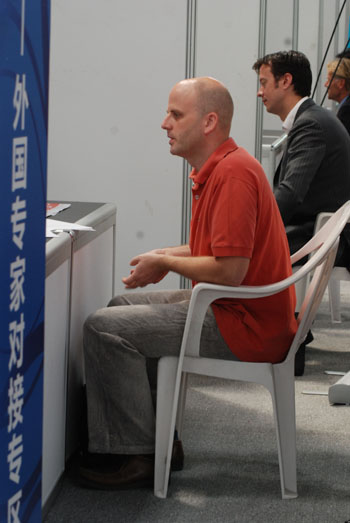 10月11日,在中國無錫人才智力交流大會上,前來應聘的外籍人員與用人單位的代表交談。當天,2009年中國無錫人才智力交流大會在無錫市體育中心開幕,近600家企業提供1萬多個崗位,吸引了近2萬名求職者進場應聘,其中不乏一些外籍人士前來咨詢。新華社發
