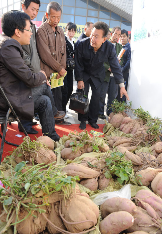 10月21日,第七屆全國特種養殖種植技術成果博覽會在安陽舉行,來自河南省安陽市等各地的數百項農業新產品、新成果在展覽會上進行了展示和交流。 圖為幾名農民在博覽會上了解巨型紅薯的種植技術。