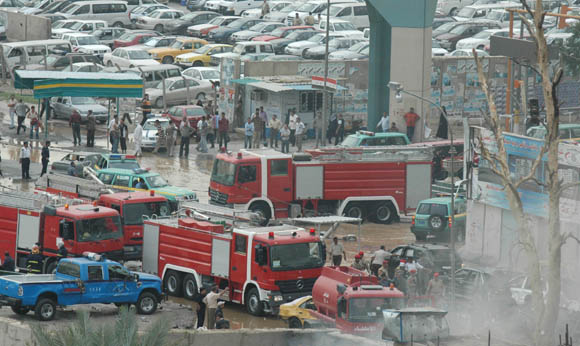 10月25日,消防車輛和伊拉克軍警趕到伊拉克首都巴格達省政府大樓前的爆炸現場救援。當天,伊拉克首都巴格達市中心發生兩起汽車炸彈爆炸,接連發生的兩起汽車炸彈爆炸造成至少132人死亡、512人受傷。中國駐伊拉克使館和新華社駐巴格達分社所在的曼蘇爾飯店遭受嚴重沖擊。