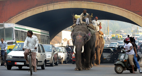 29日,在印度首都新德里,大象與汽車、摩托車、自行車一同在馬路上行進。在印度街頭有一種奇特的景觀,人們經常能看見大象招搖過市,參加婚禮等慶典活動。新華社/法新