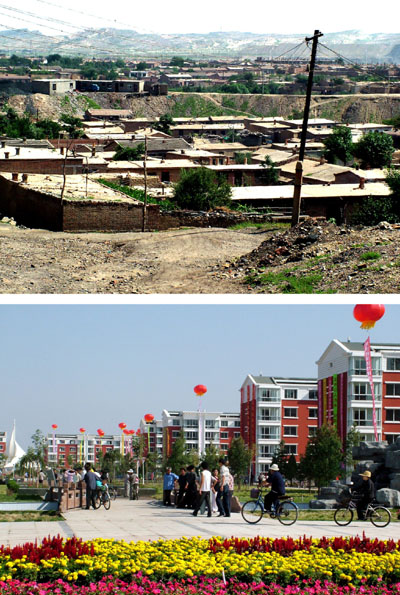 這是神華寧煤集團金能公司沉陷區老住宅原貌(上圖,資料照片)和金能公司礦工新居(下圖,2009年10月攝)對比。 |