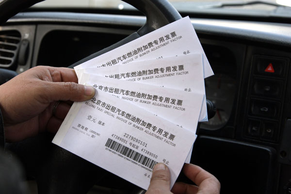 11月24日,一名出租車司機展示出租車燃油附加費專用發票。