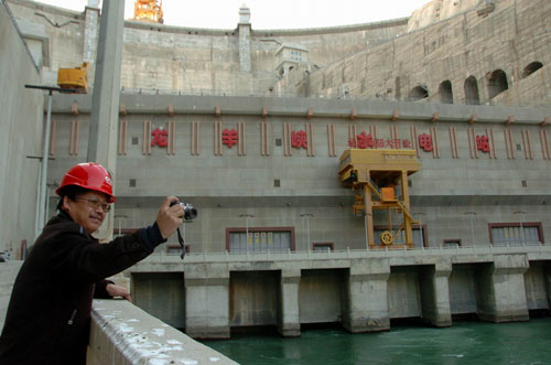 被譽為“萬里黃河第一壩”的龍羊峽水電站,自1987年投產運營以來,至今年累計發電突破920億千瓦時。圖為一游客在龍羊峽水電站壩底觀光拍照。