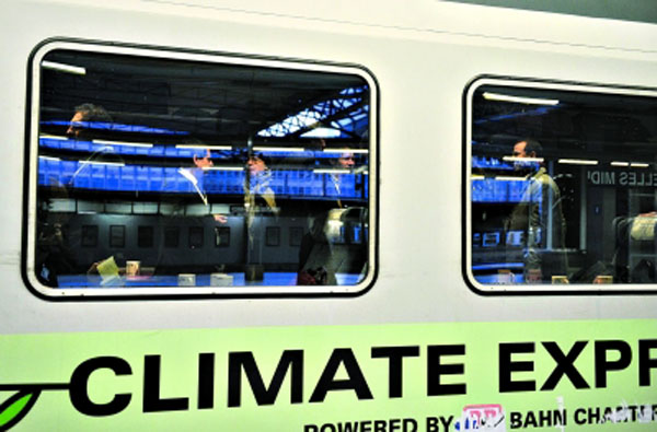 12月5日,在比利時布魯塞爾火車站,“氣候快車”準備出發。這列“氣候快車”當天從這里出發,途中?康聡坡『蜐h堡,最終抵達丹麥的哥本哈根。這列藍色和綠色涂裝的火車上載有400多人,包括聯合國氣候變化大會的與會代表、聯合國官員、環保人士和記者等。此次活動意在喚起人們關注公共交通給氣候帶來的影響和宣傳乘坐火車的環保益處!