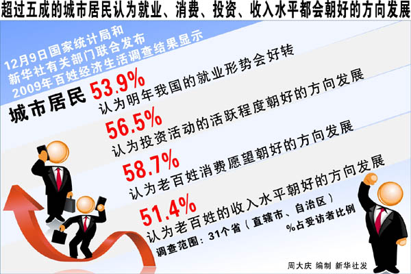 國家統計局社情民意調查中心與新華通訊社所屬經濟參考報、新華網、新聞研究所等單位今年11月聯合啟動“2009年百姓經濟生活調查”,12月9日正式發布調查結果。 此次調查由三部分組成,分別是國家統計局社情民意調查中心受新華社委托進行的電話調查,新華社31個分社在所在省區市圍繞城鄉百姓經濟生活熱點進行的入戶訪問,以及在新華網上開展的網民調查。內容涉及對金融危機的知曉度、對金融危機影響的感受、對金融危機應對措施的認知和對未來經濟走勢的判斷等。(詳見今日二、六、七版)