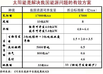 我國陸地表面每年接受太陽能輻射相當于49000億噸標準煤,全國2/3的國土面積日照在2200小時以上。如果將這些太陽能全都用于發電,約等于上萬個三峽工程發電量的總和。豐富的太陽能資源,是中華民族賴以生存、永續繁衍的一筆最寶貴的財富。 |