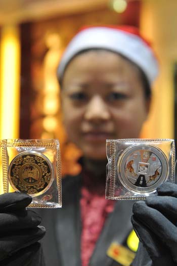 日前,在中國黃金貴陽旗艦店,以生肖“虎”為形象的金銀磚、金銀幣上架熱銷。隨著農歷虎年的臨近,款式各異的“金銀虎”收藏品深受消費者的歡迎。圖為銷售員正在展示以生肖“虎”為形象的金銀幣。