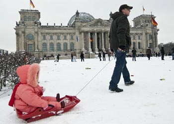 1月2日,在德國首都柏林,一名男子帶著孩子在雪地中玩耍。天氣預報稱,未來幾天德國將繼續降雪。新華社/法新 |