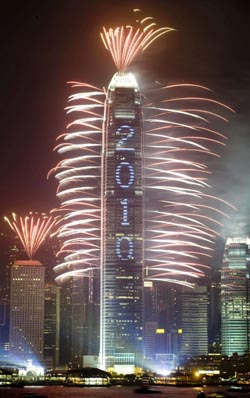1月1日凌晨,香港維多利亞港舉行迎新年煙花燈光匯演,慶祝2010年元旦的到來。新華社記者 呂小煒 攝