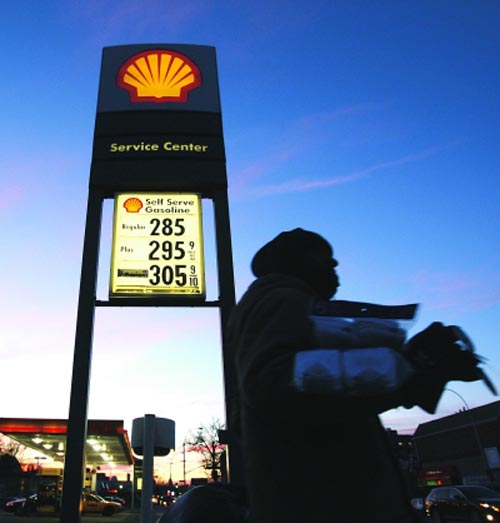 1月6日,在美國紐約,一名行人從一個加油站的油價牌下走過。由于美元走軟抵消了美國原油商業庫存意外增加的影響,國際油價6日繼續上揚,并一舉突破每桶83美元。