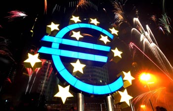 圖為懸掛在歐洲中央銀行總部前被霓虹燈和焰火映襯的歐元標志。新華社發 |