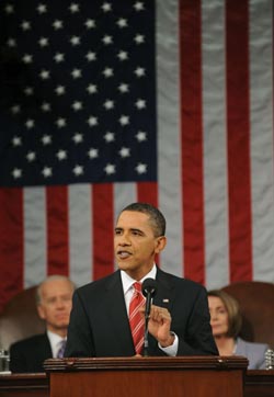 在國會議員禮節性的陣陣掌聲中,美國總統奧巴馬27日完成了他上任以來的第一次國情咨文。在這次夜晚9時黃金時間的演講中,奧巴馬侃侃而談,縱論一年成就,承諾改善民生,宣誓改革決心,以此拯救自己不斷下滑的民意支持度,并為自己隨后三年的執政之路設定新基調。