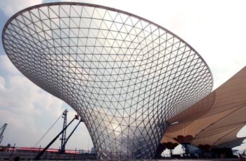 上海世博會世博軸“陽光谷”。上海世博園集成了大跨度索膜結構、“陽光谷”自然采光、雨水收集與回用、江水源和地源熱泵調控室溫以及冰蓄冷空調、光伏發電與建筑一體化、透水地面、垃圾氣力輸送、半導體照明、垂直生態綠化幕墻、節能電梯等一大批創新科技。新華社記者