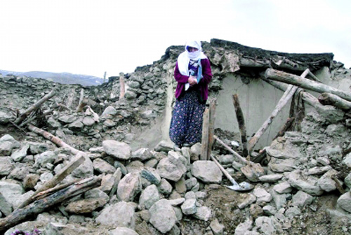 3月8日,在土耳其埃拉澤省,一名婦女站在被震毀的房子旁。