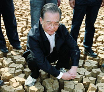 正值抗旱救災的關鍵時刻,3月19日至21日,中共中央政治局常委、國務院總理溫家寶來到云南省曲靖市,深入旱災最嚴重的地區,看望慰問受災群眾,指導抗旱救災工作。 溫家寶指出,要毫不松懈地繼續抓好抗旱救災工作,全面落實各項措施:一是優先解決群眾飲水問題。二是扎實抓好春耕備耕。三是嚴密防范森林火災。四是保持災區市場和社會穩定。 圖為3月20日,溫家寶來到陸良縣德格海子水庫干涸的庫底察看災情。
