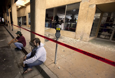 4月5日,在墨西哥下加利福尼亞州,兩名男子坐在被地震損毀的商鋪外。