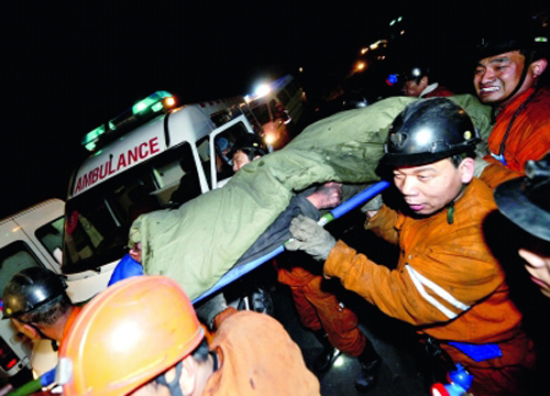 圖為4月5日,華晉焦煤王家嶺礦“3·28”透水事故首批獲救礦工被救援人員抬出井口。