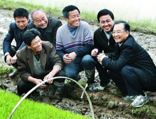 4月9日至11日,中共中央政治局常委、國務院總理溫家寶來到安徽蚌埠、池州兩地,深入田間地頭察看苗情,走村入戶看望群眾,實地考察農產品加工龍頭企業和治淮工程現場,召開座談會聽取基層干部群眾的建議。 這是4月10日,溫家寶在池州市貴池區梅龍鎮和當地農民一起察看早稻育秧情況。