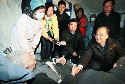 4月15日,中共中央政治局常委、國務院總理溫家寶乘專機抵達青海玉樹巴塘機場。隨即乘車前往地震災區,察看災情,看望慰問災區群眾,指導抗震救災工作。 這是溫家寶在玉樹地震災區看望慰問災區群眾時,一位藏族老阿媽雙手豎起大拇指感謝共產黨。