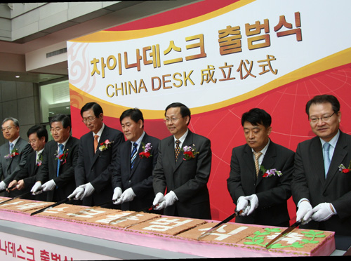 5月6日,在韓國首都首爾,中國駐韓國大使張鑫森(右三)、韓國知識經濟部長官崔炅煥(右四)、韓國貿易投資振興公社社長趙煥益(左四)等中韓人士出席韓國投資促進機構——CHINADESK成立儀式。 當日,由韓國知識經濟部、韓國貿易投資振興公社共同成立的韓國投資促進機構——CHINADESK正式啟動。CHINADESK將作為中國對韓投資窗口,給中國金融機構和投資中介機構提供對韓投資信息,同時還將為中國企業提供與韓國政府和企業聯系的機會。