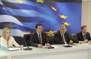 6月2日,希臘財政部長帕帕康斯坦季努(左二)在雅典出席新聞發布會。 希臘政府當天宣布在應對嚴重的債務危機的緊縮政策框架下,政府將對一系列國有公司進行私有化改革。在未來3年,希臘政府希望通過合理使用公共資產,募集30億歐元的資金。