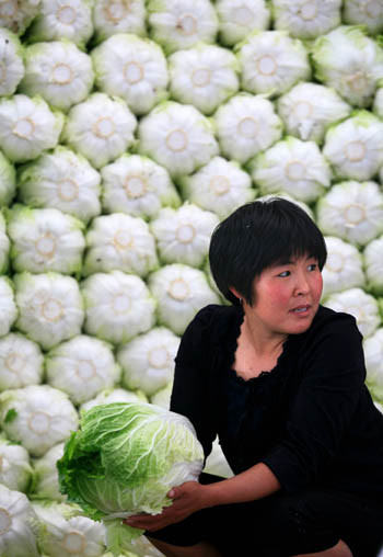 6月3日,在濟南市匡山農產品綜合交易市場,一位商販在挑選白菜。 當日,來自濟南市最大的農產品集散地——匡山農產品綜合交易市場的統計數據顯示,由于氣溫上升和本地菜大量上市,六月初菜價較上月同期下降近五成,白菜、西葫蘆等少數蔬菜價格回落更多。受此影響,外省市來濟南批發蔬菜的車輛明顯減少,農產品日成交量由1500噸下降至1000噸左右,蔬菜批發也進入淡季。
