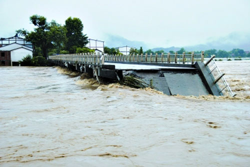 206國道江西鷹潭境內龍虎山魚塘大橋被洪水沖垮,交通中斷(6月20日攝)。 近日,受持續強降雨影響,江西省鷹潭市境內的鐵路、高速公路和國道全面中斷。目前,當地有關部門正組織力量全面搶修水毀交通設施。新華社發