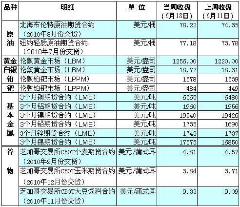 受歐元區經濟數據利好、美元走弱以及原油庫存減少等因素的提振,紐約、倫敦兩地油價14日雙雙重返每桶75美元上方,16日一度升破每桶78美元,創下6周以來最高收盤價。 自5月底美國進入夏季汽油消費季以來,汽油消費有所增加。根據美國能源部16日報告,上周美國汽油消費需求呈現上升勢頭,而過去4周成品油消費需求與同期相比增加13.6%。此外,美國煉油廠開工率有所下滑,與前一周相比上周煉油廠開工率下滑了1.2%至87.9%。受此影響,紐約輕質原油期貨7月合約在17日小幅下跌之后18日出現小幅回升至每桶77.18美元。 受一系列美國經濟數據不及預期以及美元匯率下跌等因素的綜合影響,紐約商品交易所18日黃金期貨連續第二個交易日創下歷史新高,收于每盎司1258.30美元。 美國勞工部17日公布的數據顯示,截至6月12日前的一周,美國首次申請失業救濟人數意外上漲1.2萬人至47.2萬人,顯示出美國就業市場依舊疲軟,加上美國5月份消費者價格指數連續第二個月下跌,令投資者對美國經濟前景失去信心,也令市場預測美國聯邦儲備委員會將會繼續維持超低利率政策以刺激經濟復蘇。 此外,西班牙政府17日成功發行價值35億歐元的10年期及30年期國債,顯示出市場憂慮情緒已得到逐步緩解,提振歐元對美元匯率繼續攀升。有分析稱,美元走弱可以使美國以外的投資者降低購買黃金的成本,刺激黃金需求,這可能將導致黃金期貨價格在幾周內進一步升高至每盎司1300美元的水平。 受油價大幅上漲提振,以及潮濕氣候和需求加大等因素的綜合影響,芝加哥期貨交易所18日小麥、大豆和玉米期貨價格較前一周均有上漲。近期加拿大西部持續的降雨以及美國南部大平原部分地區的潮濕天氣令投資者預期加拿大小麥減產,近期有所回落的美元匯率也可能吸引國際采購商轉而購買美國小麥。美國中西部近期出現的過量降雨和洪水也令當地大豆播種工作陷入停滯,為大豆期價提供了利好因素。