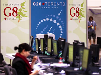 在位于加拿大多倫多的G8和G20加拿大峰會新聞中心,先期抵達的記者開始報道準備工作。新華社發(鄒崢