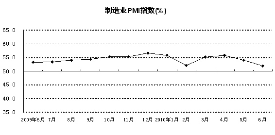 2010年6月,中國制造業采購經理指數(PMI)為52.1%,低于上月1.8個百分點,該指數已連續兩個月出現回落,但仍位于臨界點——50%以上。表明制造業經濟總體繼續保持增長態勢,但在國家近期出臺的宏觀經濟政策以及世界經濟復蘇步伐放慢等因素作用下,增速趨緩。